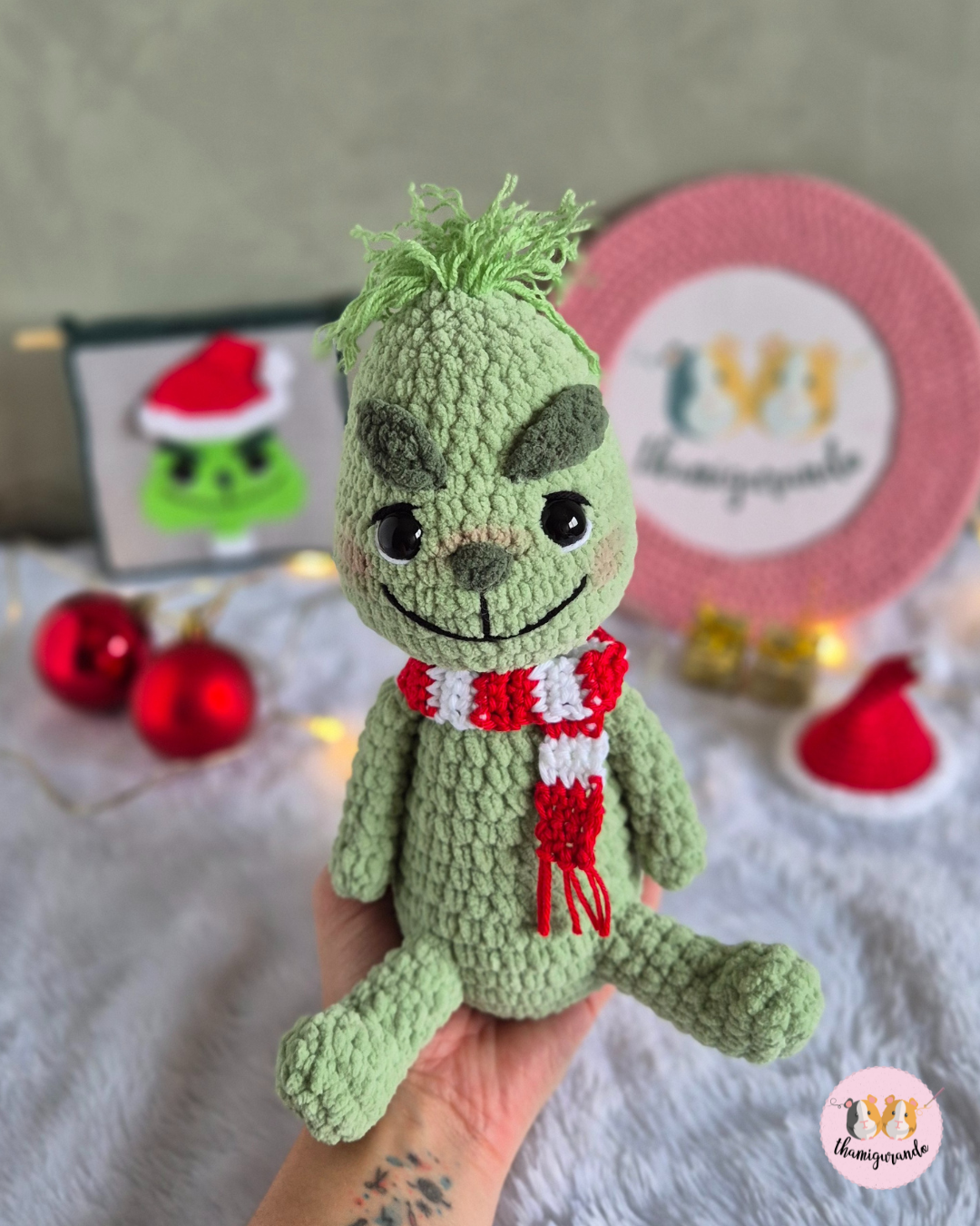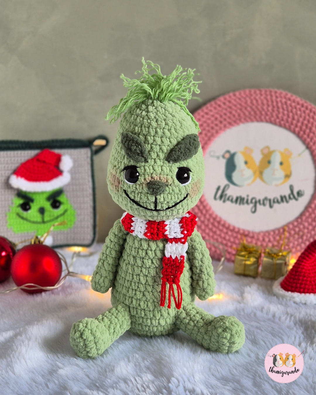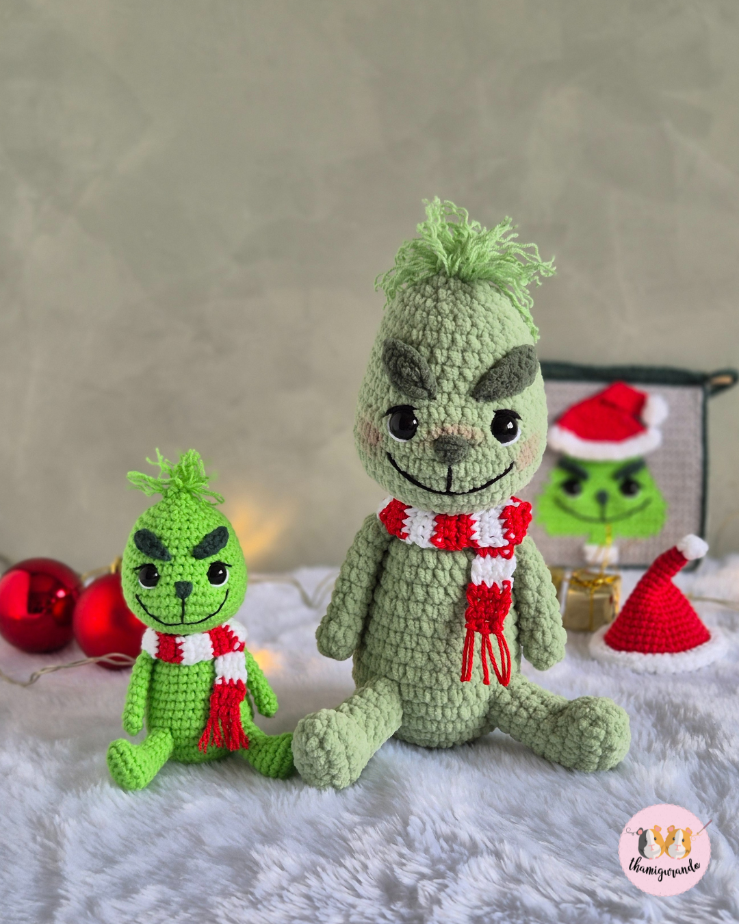 Tamanho: com os materiais utilizados, o mini Grinch ficou com aproximadamente 14cm e o Grinch pelúcia ficou com aproximadamente 21cm (variações do tamanho podem ocorrer de acordo com a tensão de seu ponto, tamanho da agulha, e materiais escolhidos para a confecção da peça).